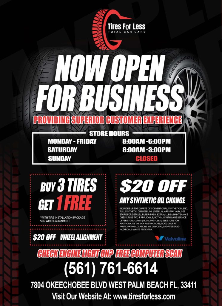 In conclusion, at Tires for Less Total Car Care, we are dedicated to providing top-quality auto repair services in West Palm Beach, FL. From tire sales to wheel alignment and exceptional customer experience, we have you covered. Visit us today or give us a call at (561) 791-6614 to schedule an appointment and experience the difference of our services. Your satisfaction is our top priority.